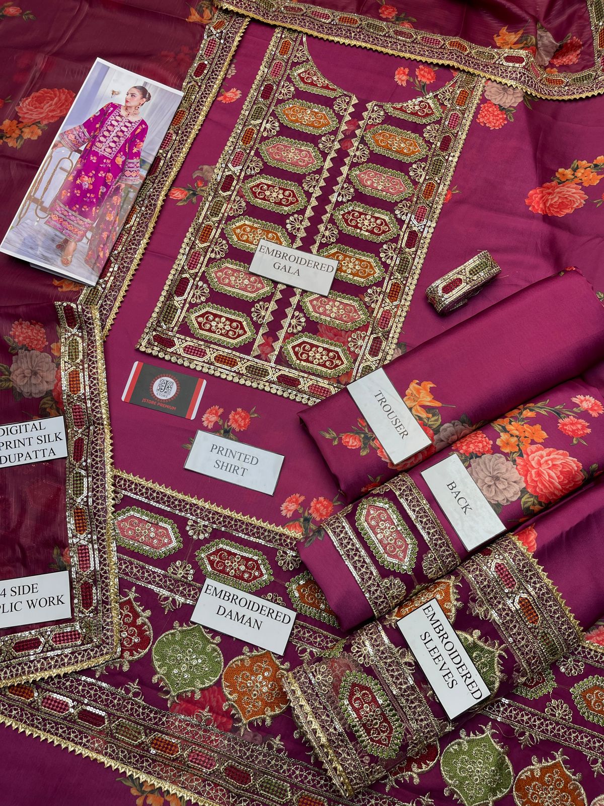 -FORNT AND BACK FULL PRINTED ON SHAMOOZ SILK WITH HEAVY EMBROIDED NECKLINE ALONG WITH FRONT BROAD BORDER AND BACK BORDER MORE OVER CHAAK EMBROIDERY PATCH IS GIVEN(MASTER QUALITY)