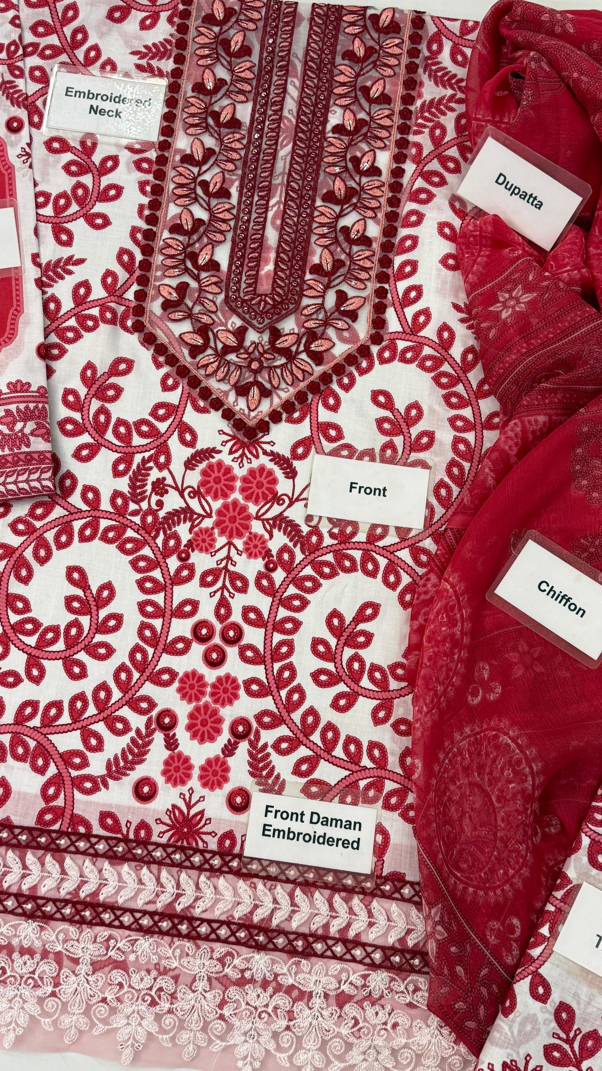 MARIAB RED WHITE WITH CHIFFON DUPATTA |3 PIECE UNSTICHED